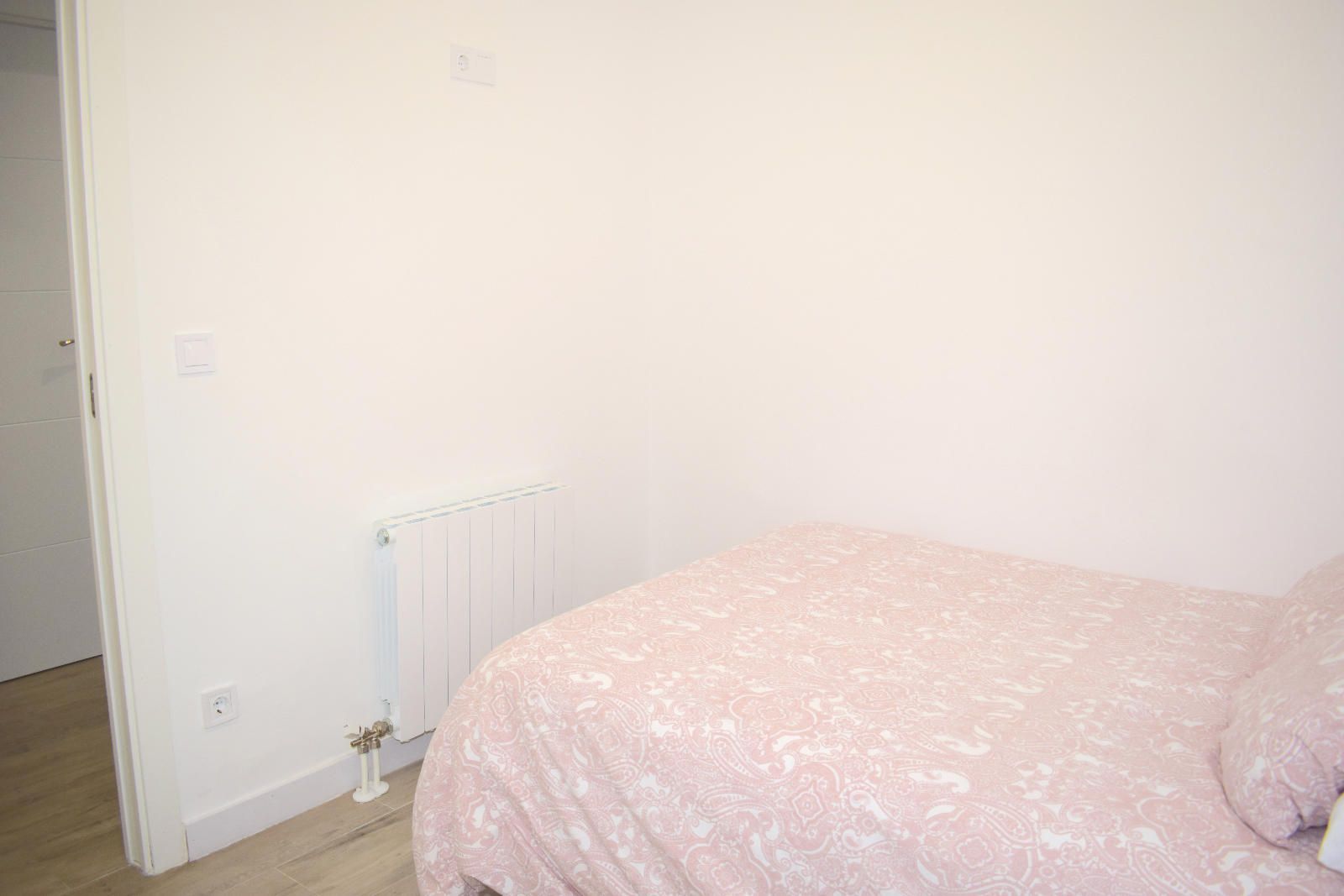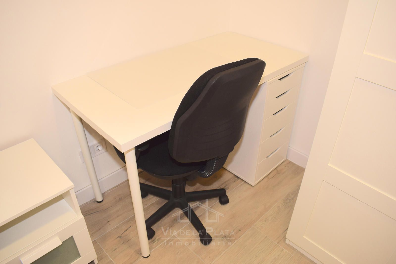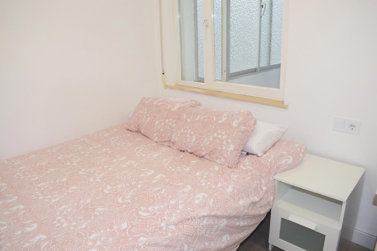 La habitación dispone de una cama doble de 135 x 190 cm, un gran armario de 150 x 226 cm, mesita de noche, cómoda, escritorio amplio y silla ergonómica de estudio, todo en perfecto estado y con una excelente iluminación natural.
