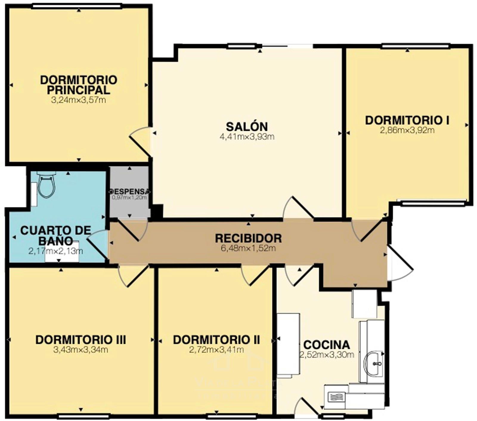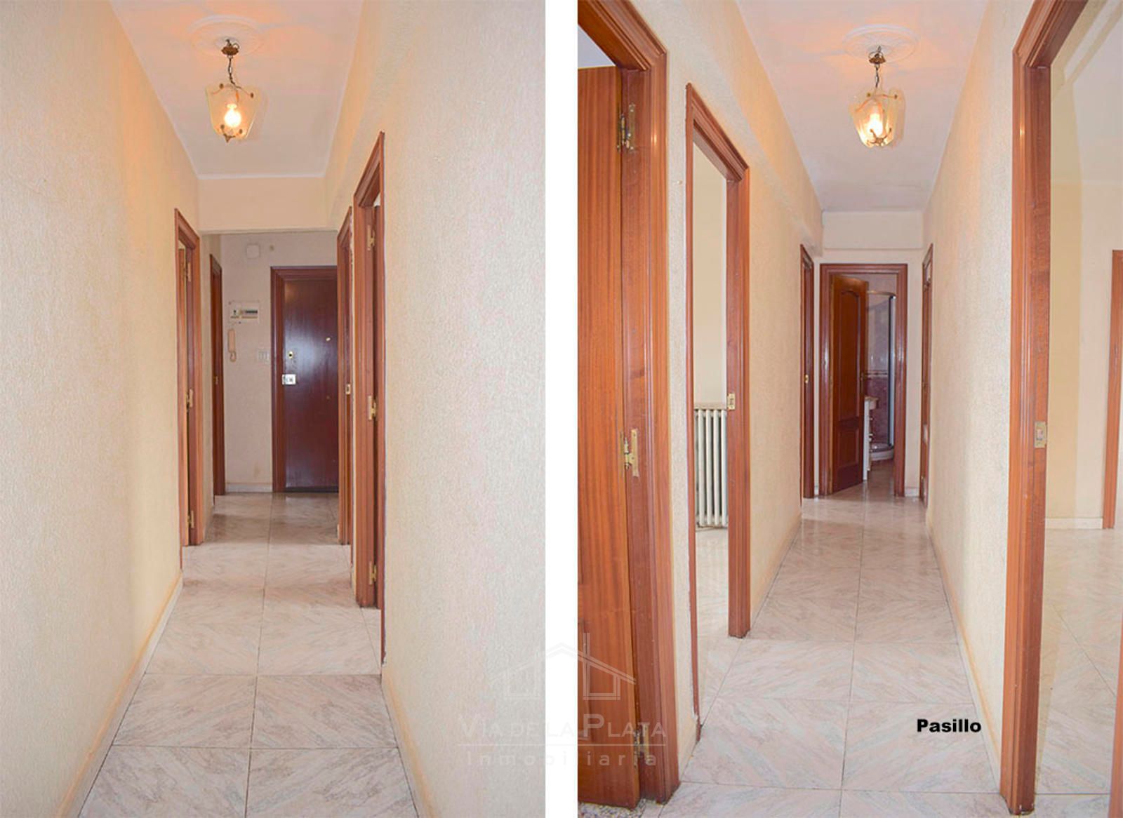 Siguiendo el recorrido encontramos el salón, amplio y exterior al Paseo de la Estación, con orientación oeste, perfecto para disfrutar de la luz de la tarde. Frente al salón se ubican dos dormitorios dobles exteriores. Al final del pasillo se encuentra un cuarto de baño espacioso, una despensa y un cuarto dormitorio doble exterior.
