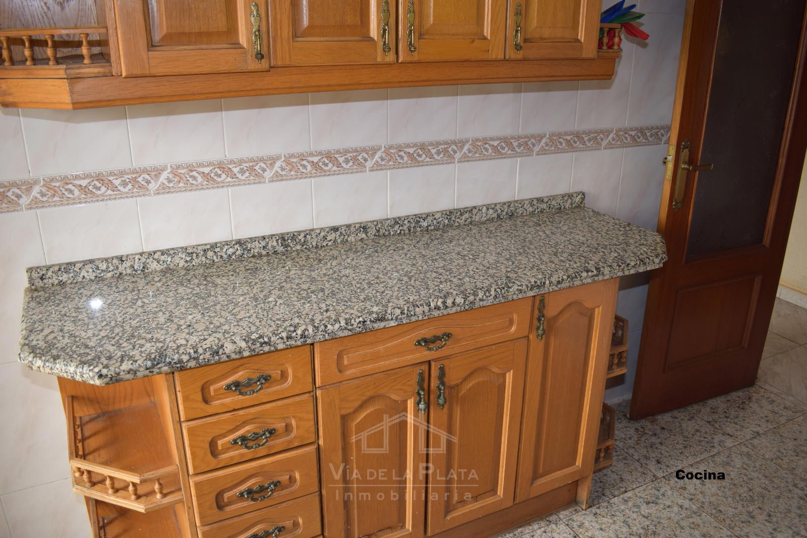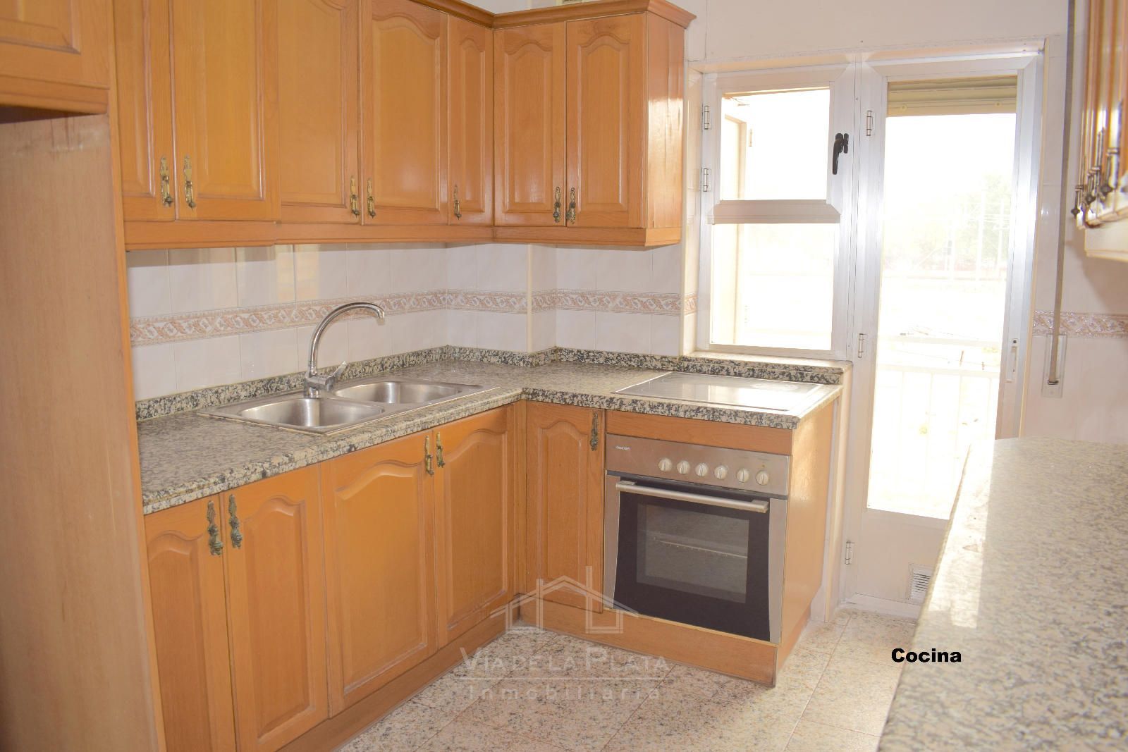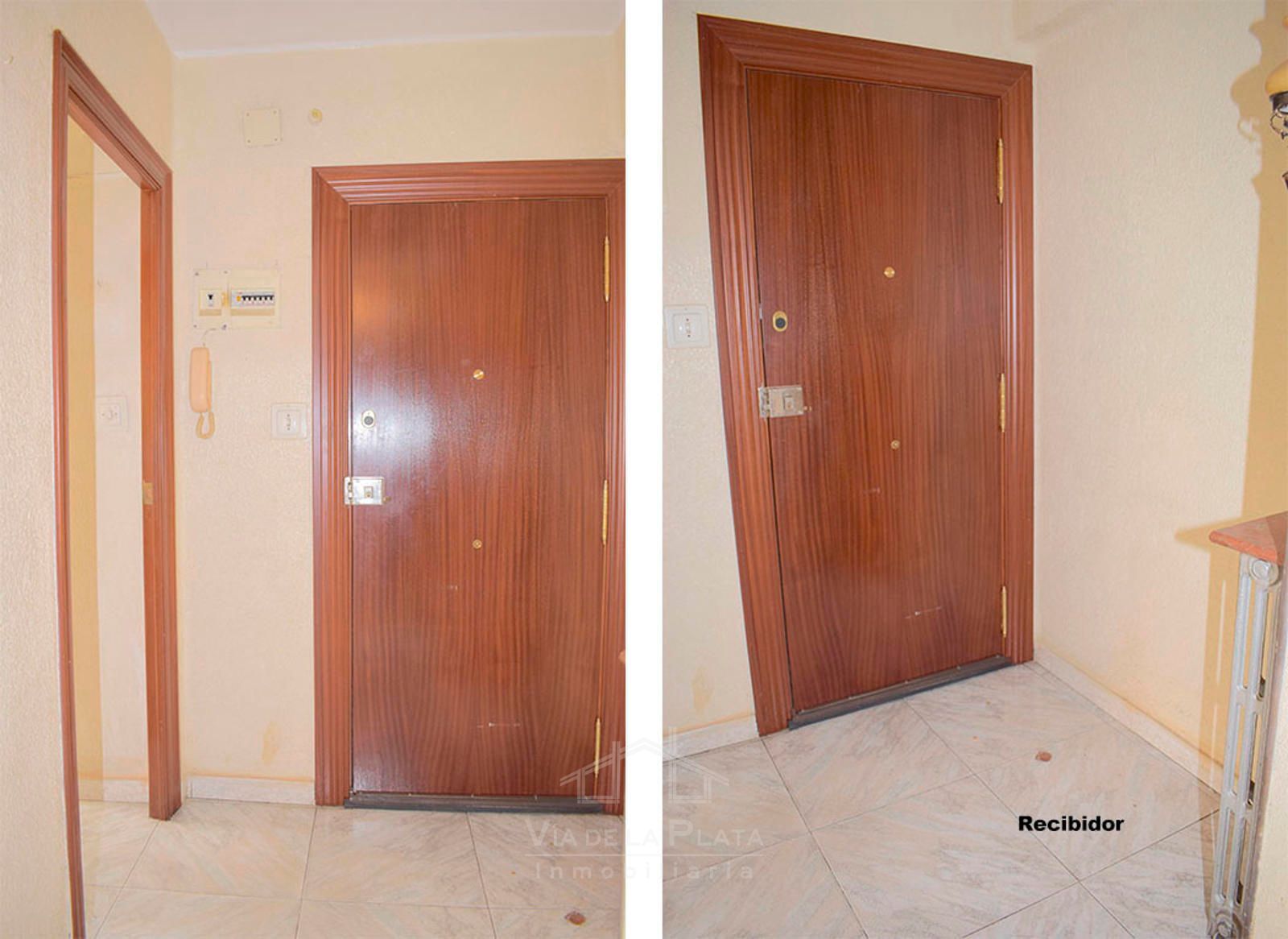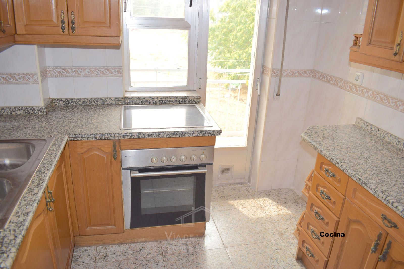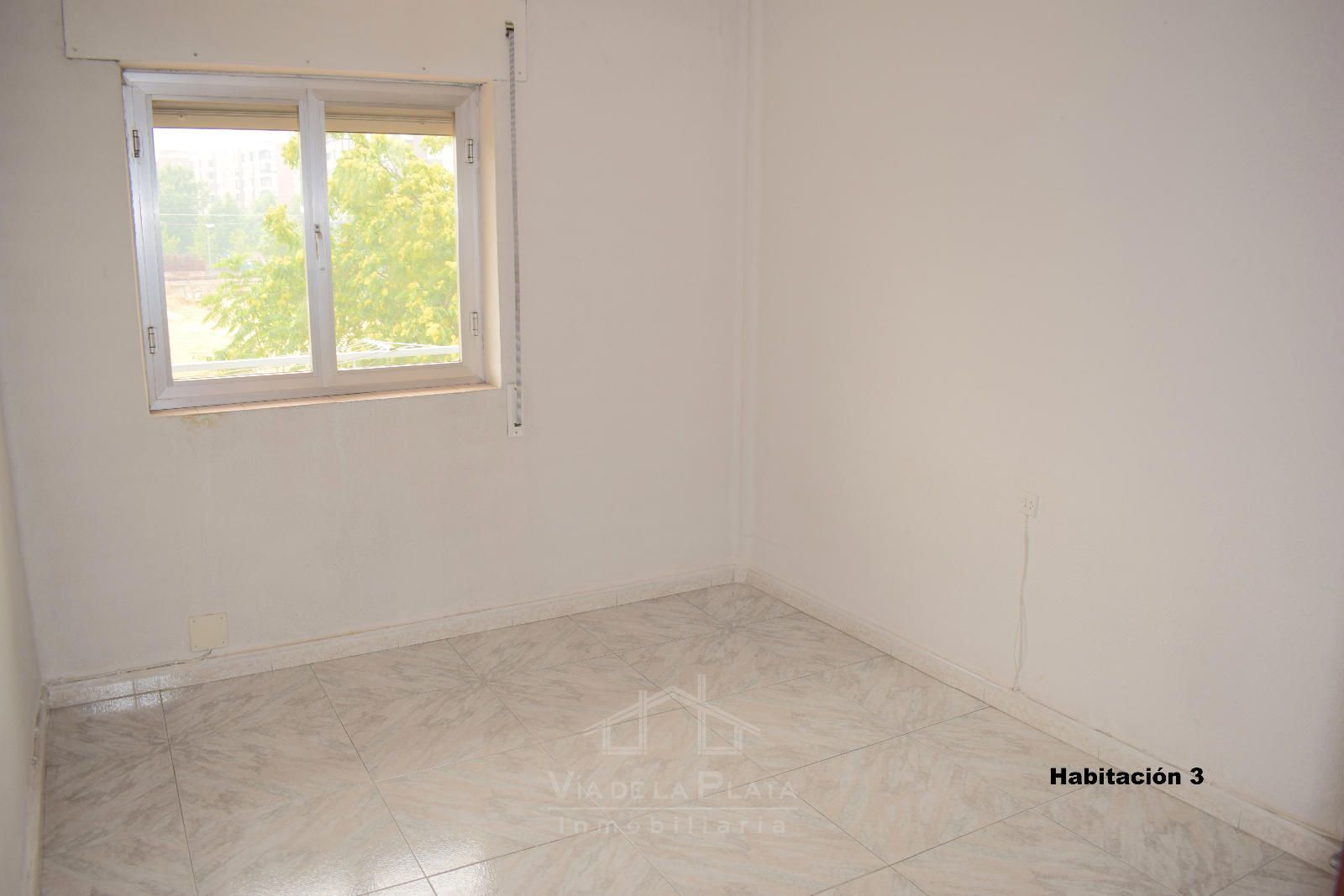 La vivienda se distribuye a través de un recibidor que conecta con un pasillo central del que nacen todas las estancias. El primer espacio es un dormitorio doble (actualmente usado como sala de estar). Justo enfrente se encuentra la cocina, con orientación este y salida a un balcón exterior con vistas a las vías del tren. En los terrenos de enfrente está proyectada la construcción de un parking público, lo que mejorará aún más la comodidad de la zona.