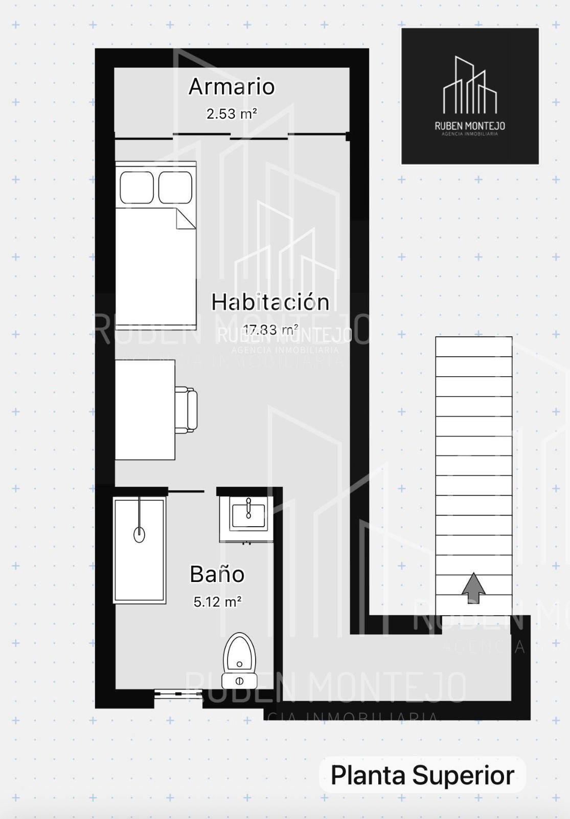 La escalera volada nos lleva hasta la planta superior donde encontramos el segundo dormitorio que cuenta con una ventana de tipo Velux y posee baño en suite con plato de ducha.