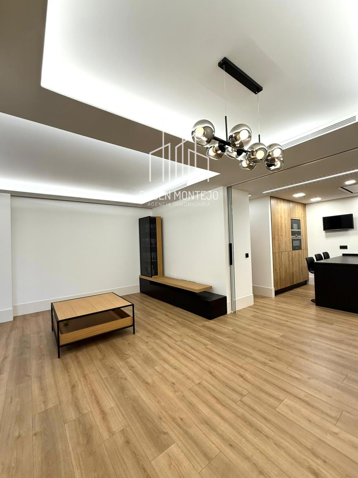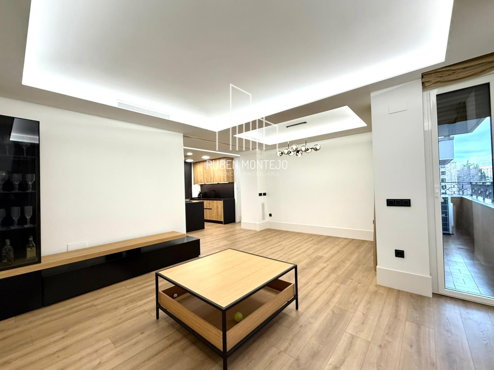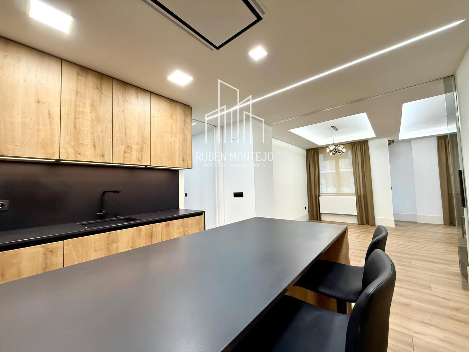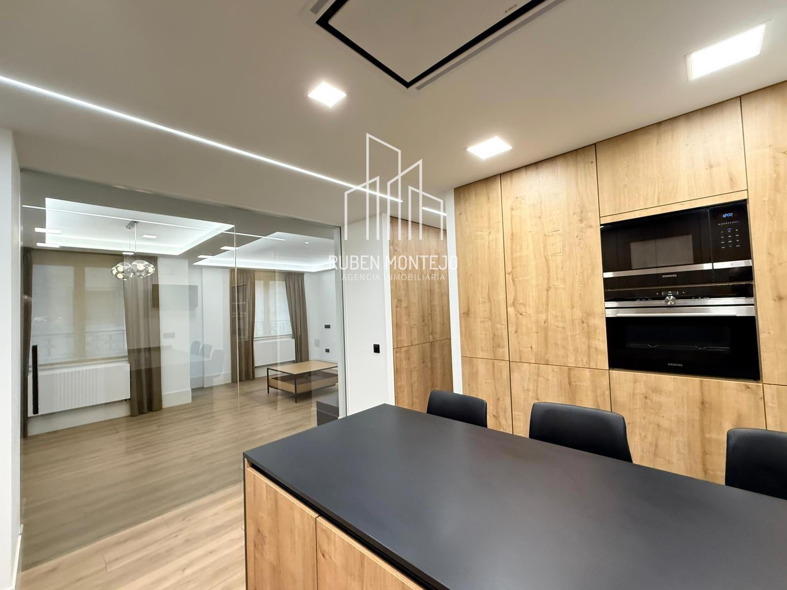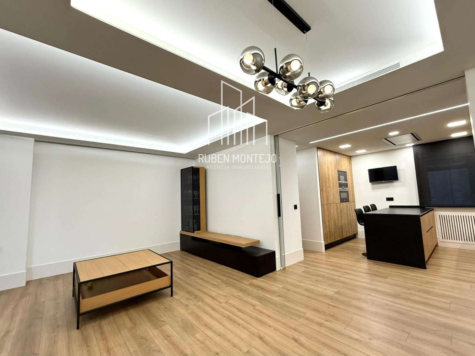 - Amplio salón con salida a balcón, con techos foseados con led indirecto, que cuenta con una puerta corredera de vidrio para poder aislar completamente de la cocina. Esta puerta al dejarla abierta queda totalmente oculta entre tabiques.