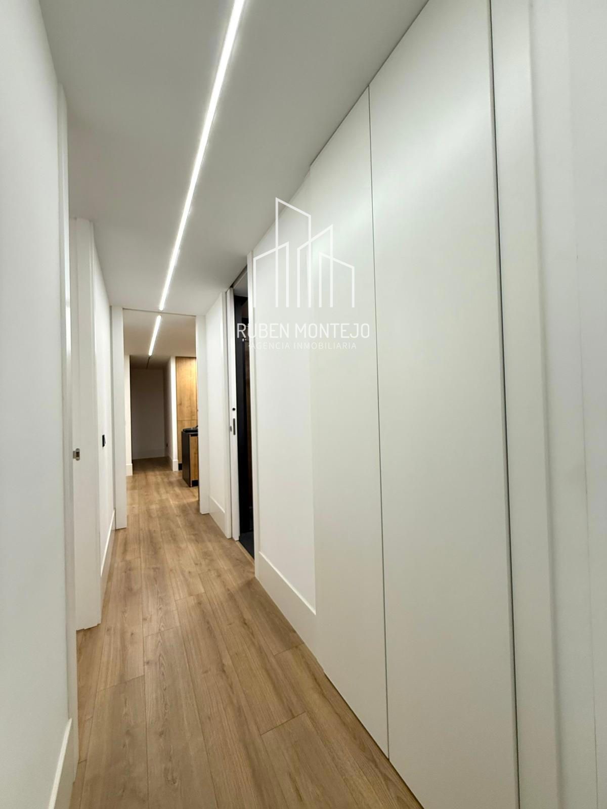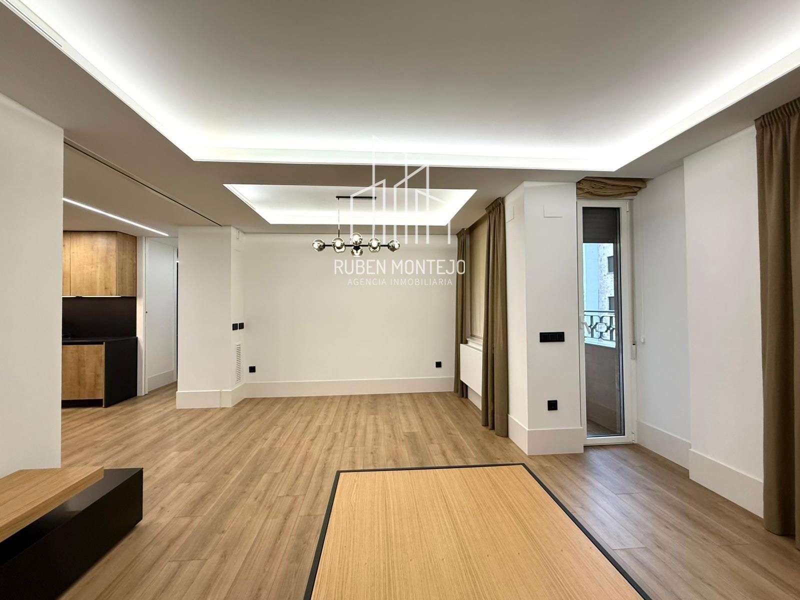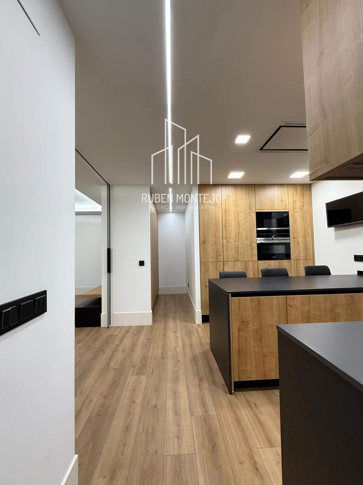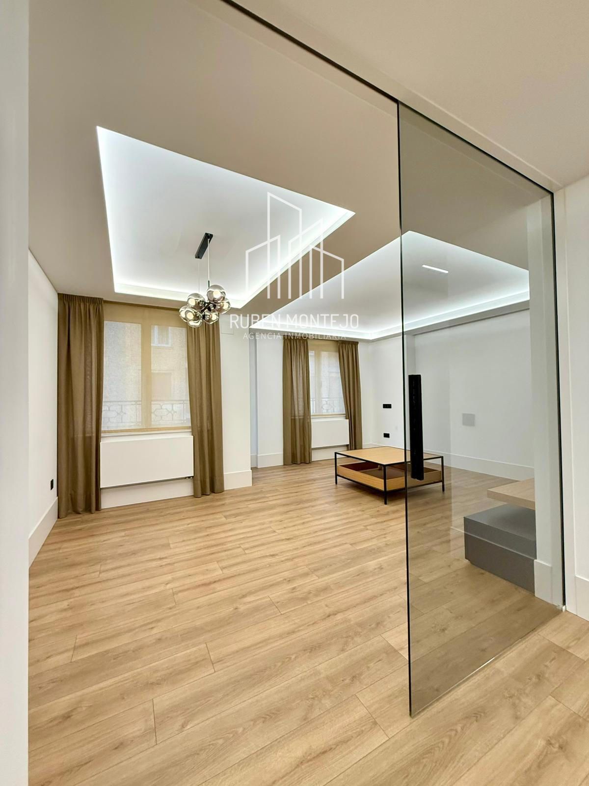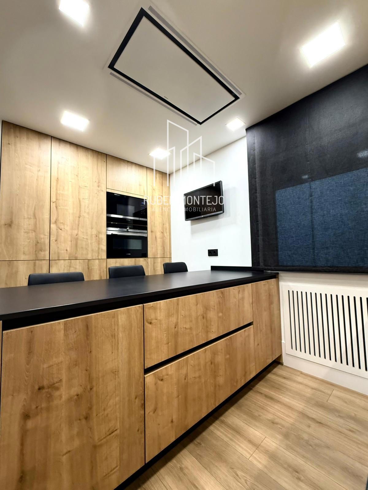 - Amplio salón con salida a balcón, con techos foseados con led indirecto, que cuenta con una puerta corredera de vidrio para poder aislar completamente de la cocina. Esta puerta al dejarla abierta queda totalmente oculta entre tabiques.