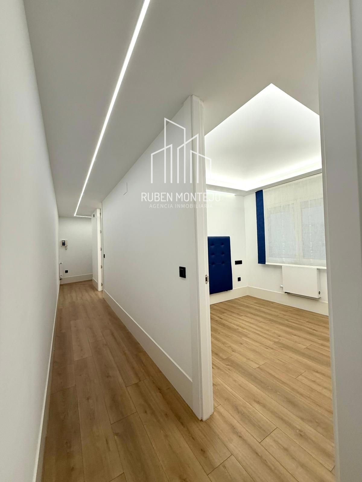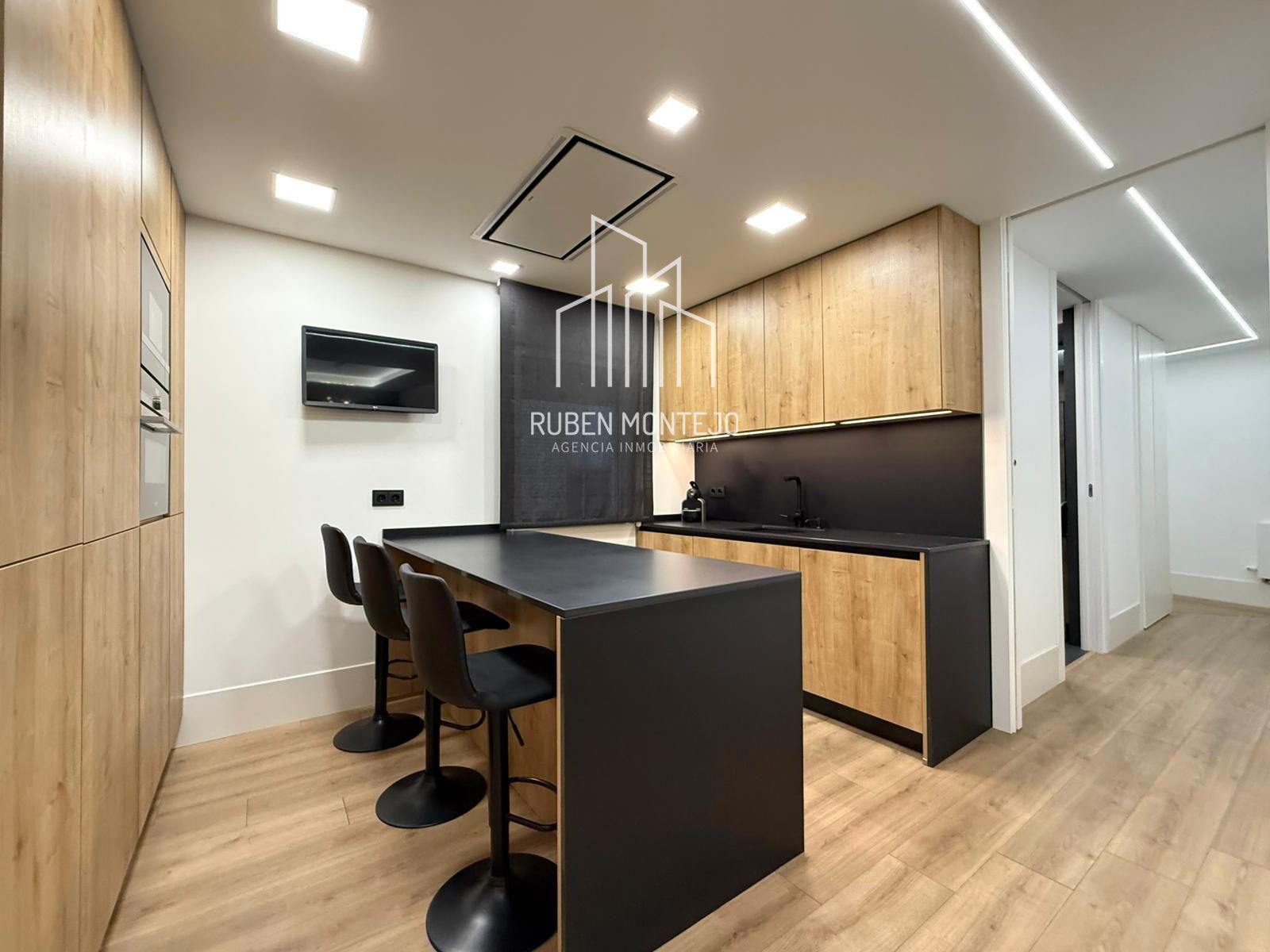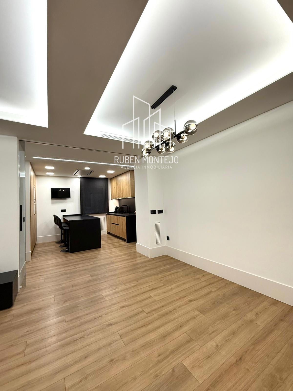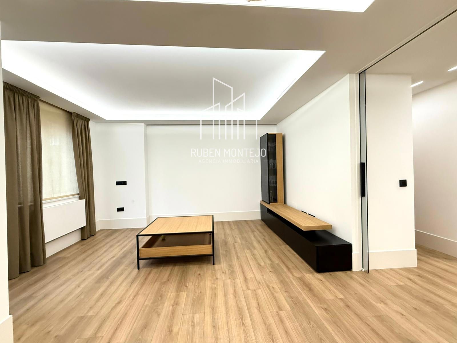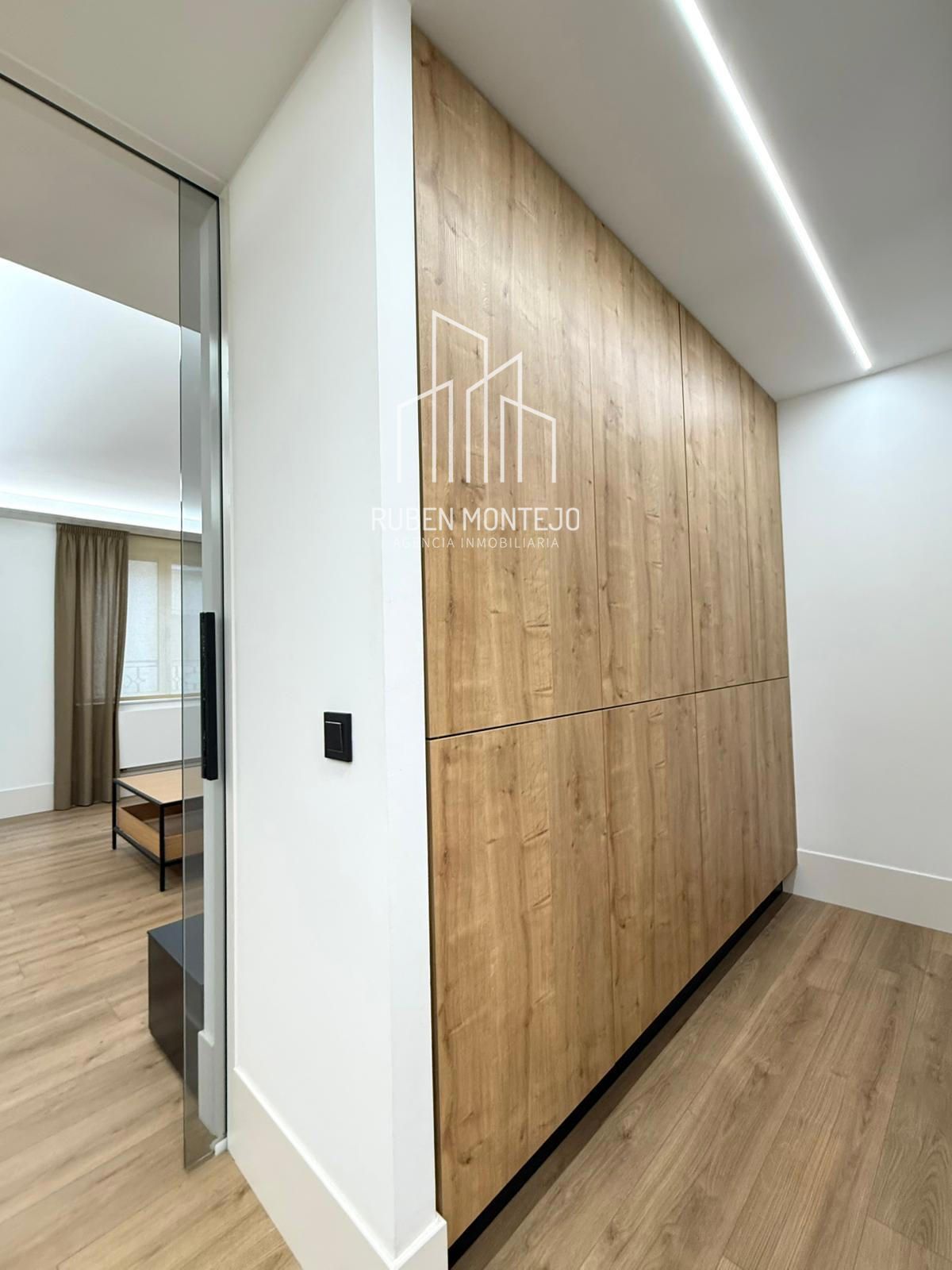 - Amplio salón con salida a balcón, con techos foseados con led indirecto, que cuenta con una puerta corredera de vidrio para poder aislar completamente de la cocina. Esta puerta al dejarla abierta queda totalmente oculta entre tabiques.